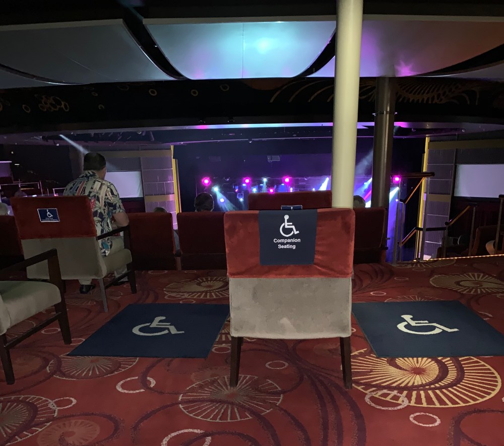 The theatre is split level on deck 3 & 4 both having wheelchair access and reserved seating for wheelchairs and companions.