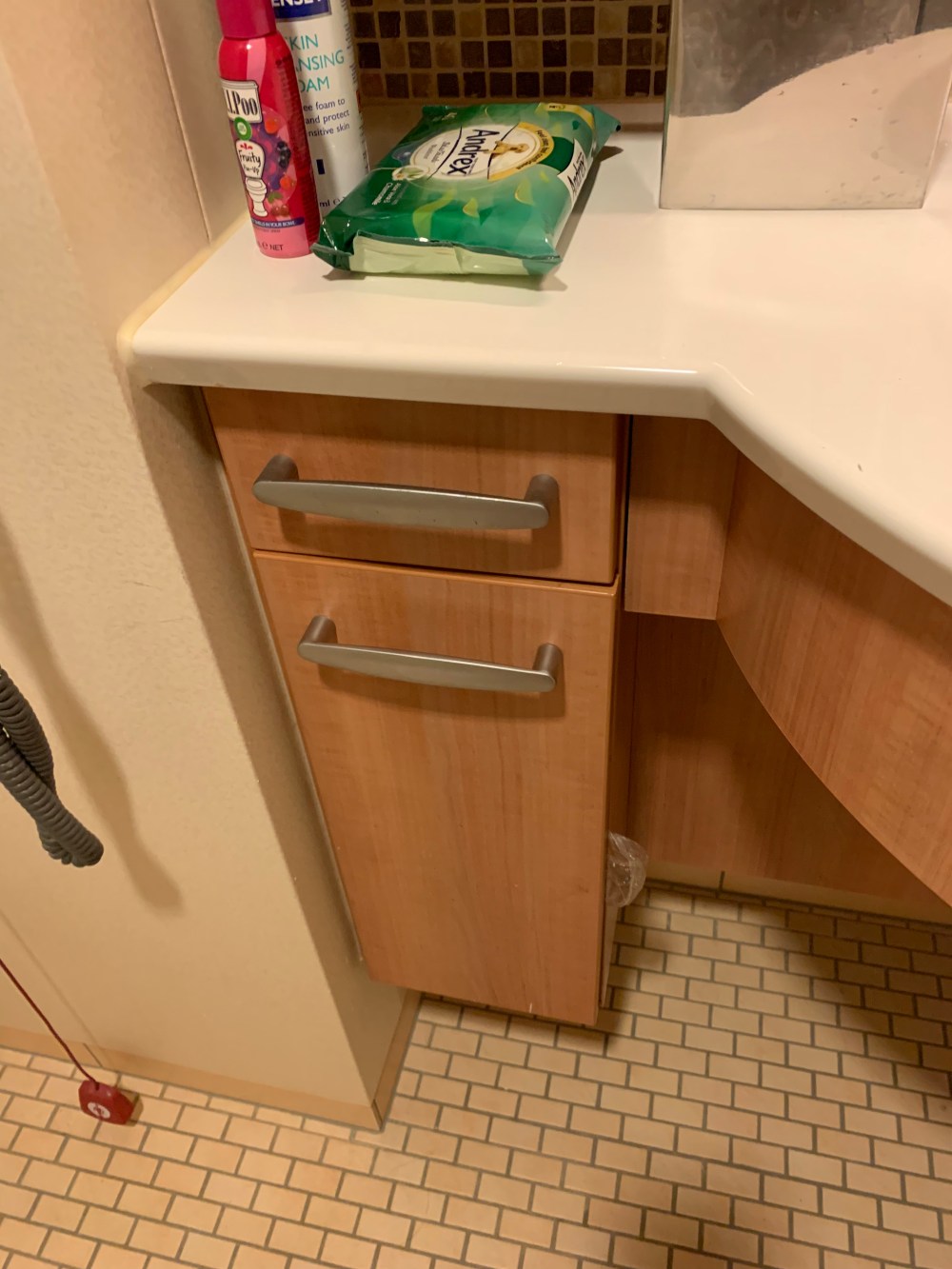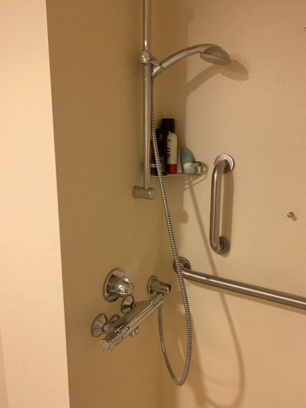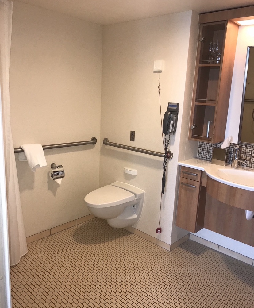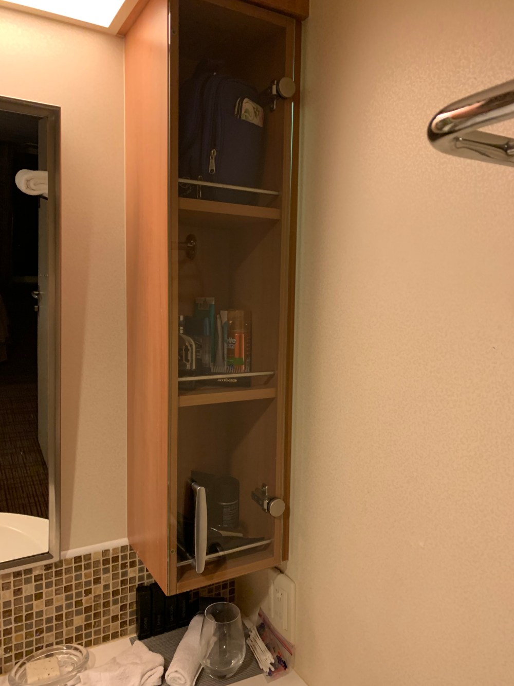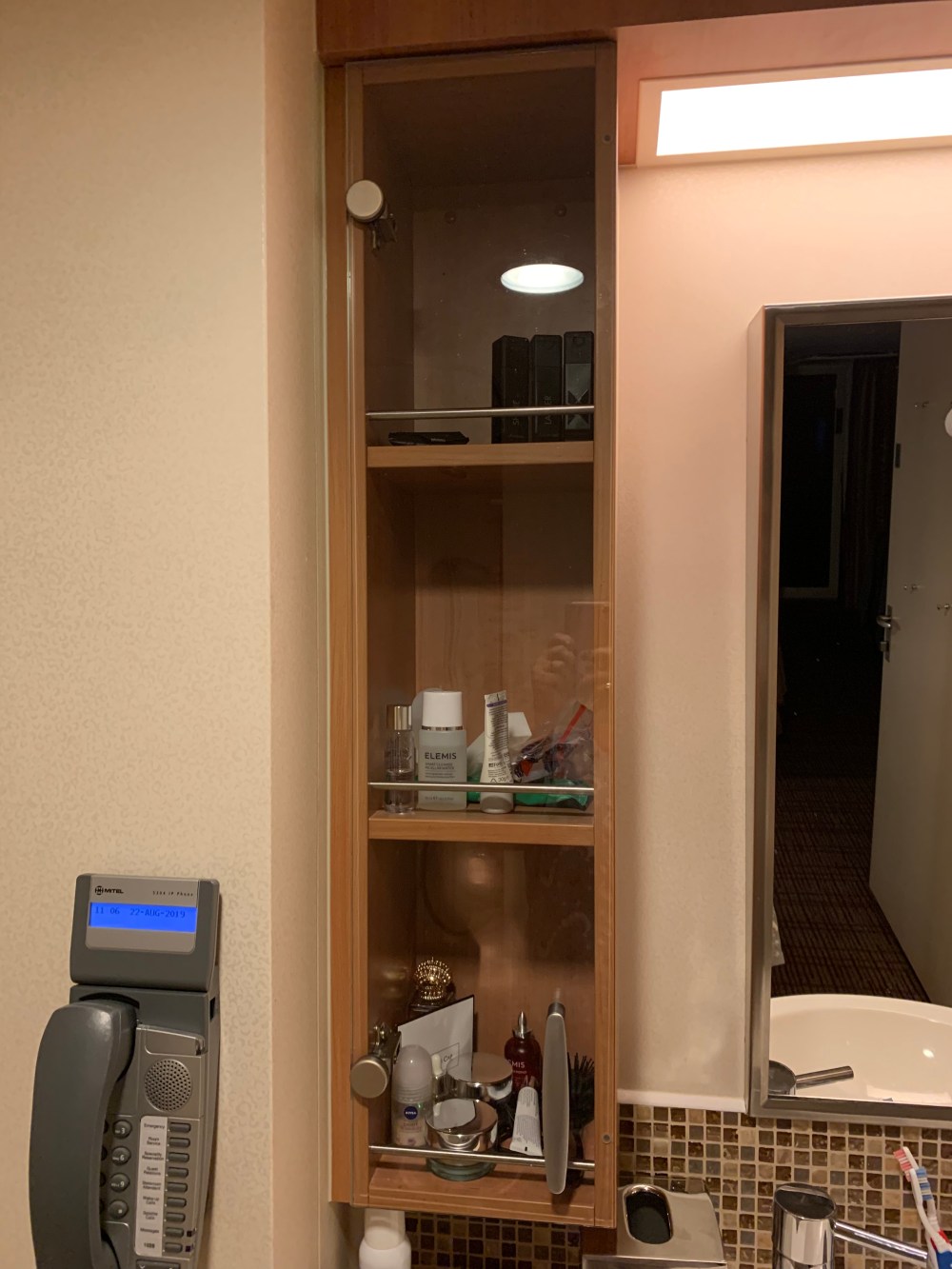 The toilet is a standard cruise toilet, you have bars going around the shower and toilet as grab rails however I felt it needed a drop down rail to the side of me but that’s my personal preference. As I mentioned there is a lot of storage around the sink to be honest I think it’s the best I’ve ever had on a cruise ship! There is another phone in Wetroom next to the toilet with a pull cord but this door is not automatic but not heavy.