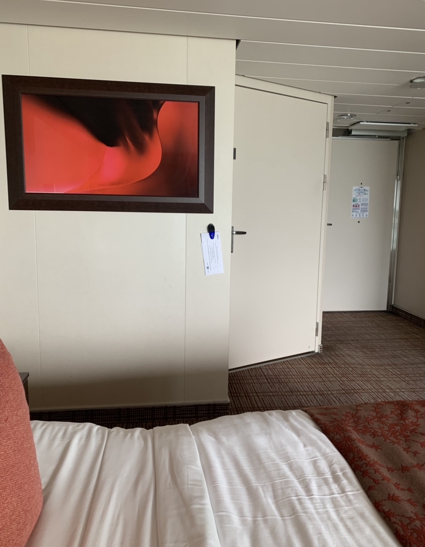 There are also 9 draws, 4 shelves, a safe and a fridge in the room along with a small table which is height adjustable. As above you can see with my hubby trying it out the half sofa that can become a single bed. Both sides of the bed have a small bedside table, my side the right had a US socket and hubby on the left had the phone and pull cord! they are small but adequate. There are also a bedside light attached to the headboard which has a switch under to turn on and off my side had two switches for the main lights also, they are easy to reach and not too bright. One the main counter space you get champagne glasses & tumblers along side a kettle for UK sailings only. There are 2 US sockets there and 1 Euro. Above is a 32 inch interactive tv where you can see you bill, order things like room service, gifts, book speciality restaurant etc.
