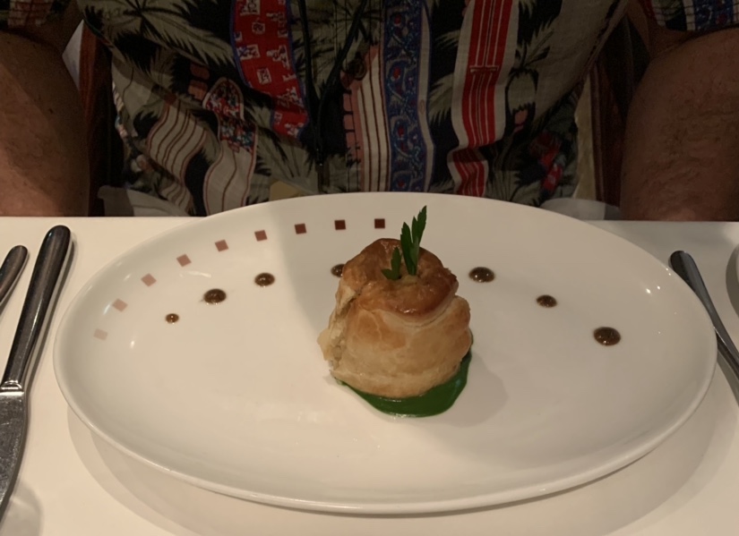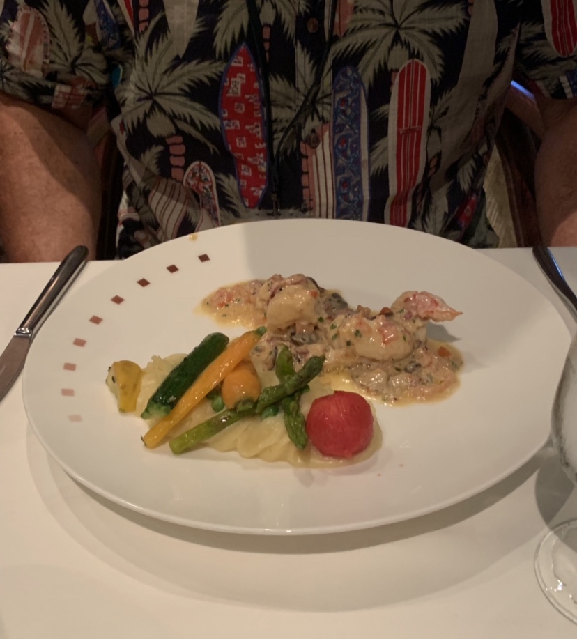Murano we were a little nervous about as we haven’t really had french food and didn’t like the idea of snails or frogs legs however the menu once we understood it was pleasantly encouraging. Carl had scallops and for main lobster flambéed next to the table. I had mushroom cappuccino and chateaubriand (beef steak) cut next to me at the table. We shared desert of a mixture of different little lovelies. We were really impressed with the food and Carl said it was the best lobster he has ever had. We both really enjoyed it and think it’s worth paying the cover charge. I wish my stomach wasn’t particularly paralysed so I could eat more! I know many people don’t like to pay extra for food while on a cruise however we do so we can experience all that is offered again this is a personal choice.