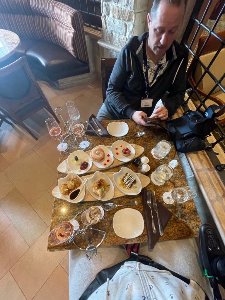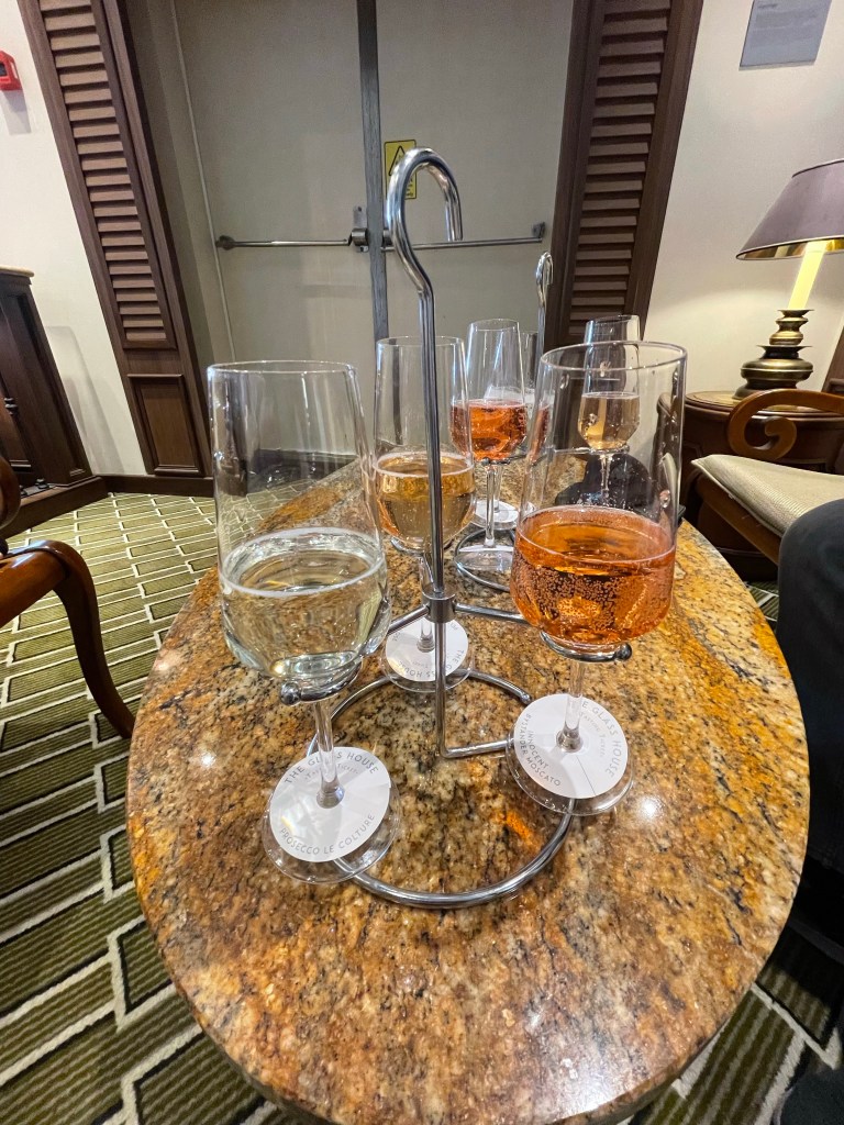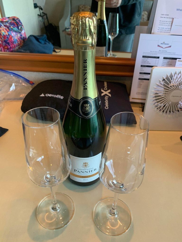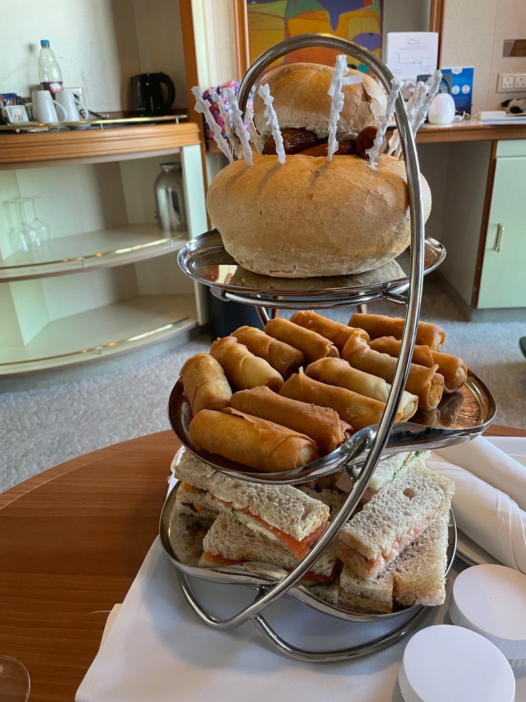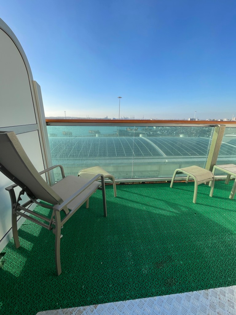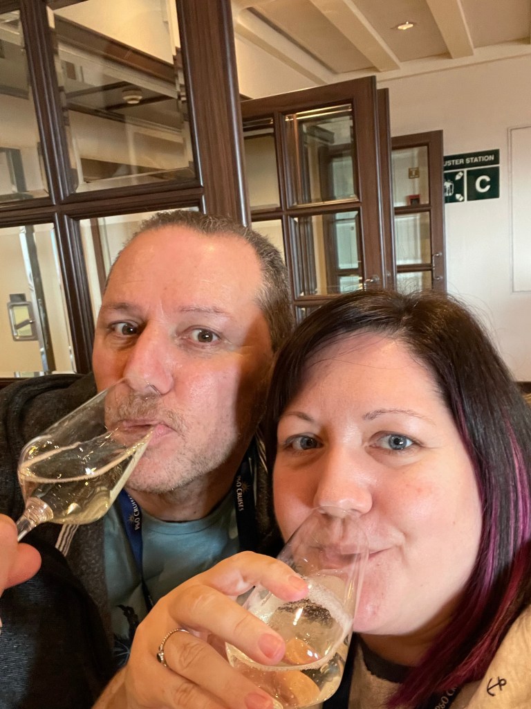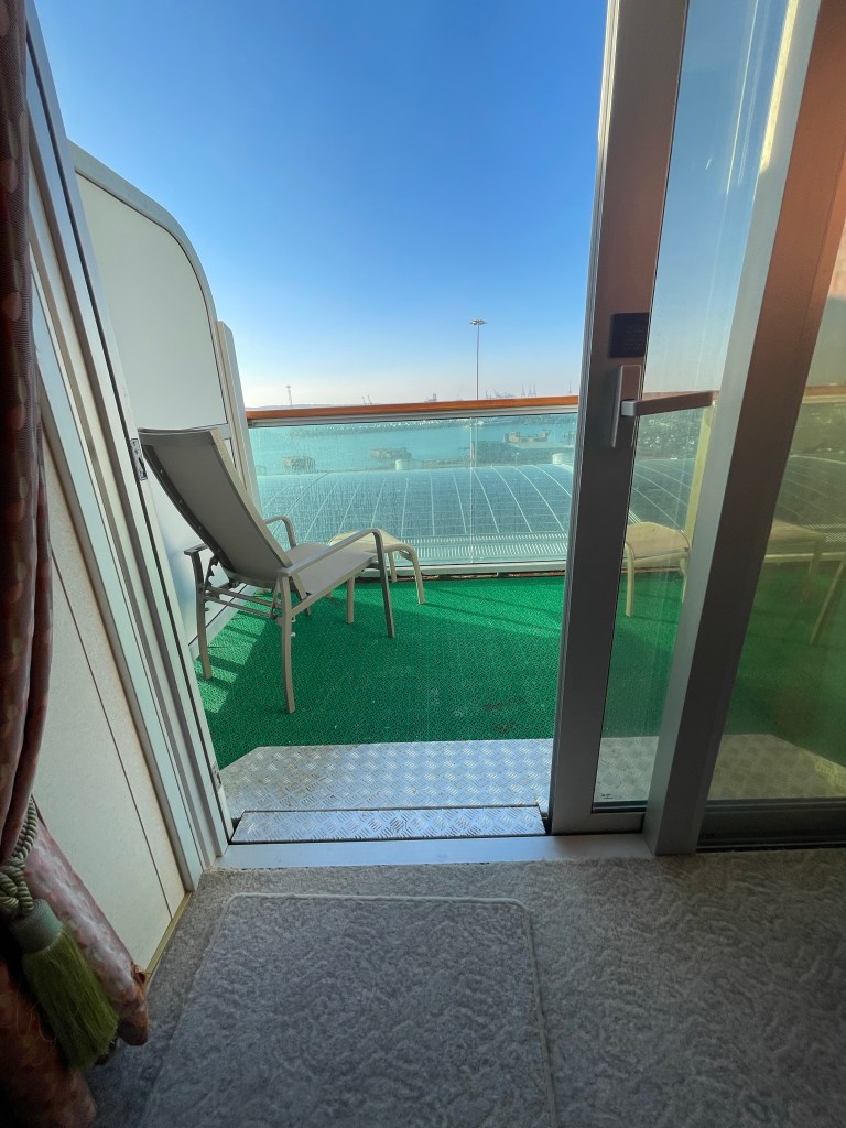 We went straight to our cabin D308 as usual so we could drop off all our medical bags and as expected our cabin wasn’t quite ready. We saw our room steward Godfrey who was excellent and we explained I have medical equipment and medication which I have to take at set times and he was really good as we left him to go and sort a few bits out with guest services, the spa and grab a drink and we went back to the cabin at 13:00 and he was just finishing ours. Our cabin which I believe is classed as a superior deluxe accessible balcony was really nice, she is a little worn and dated which is something that might be on the agenda for dry dock as she is there a while however it didn’t ruin our cruise at all, the only issue we had was that the air conditioner in the bedroom area didn’t seem to cool it down and my husband could feel warm pipes under his feet next to the bed which could have been part of why it was so warm, the lounge area however was lovely and super cool! There isn’t many accessible superior deluxe balconies on Ventura so you have to be quick and they are expensive compared to a standard balcony. You obviously get a lot more room, a bottle of champagne and a box of chocolates on arrival, where in a standard you don’t have seating area and extra tv and no champagne or chocolates (the tv is tiny, we hope they are upgrading the tv’s as that really does need to be done).