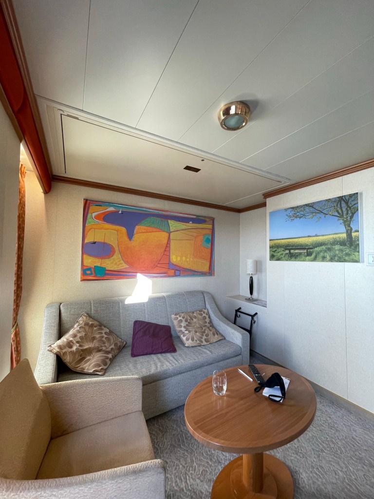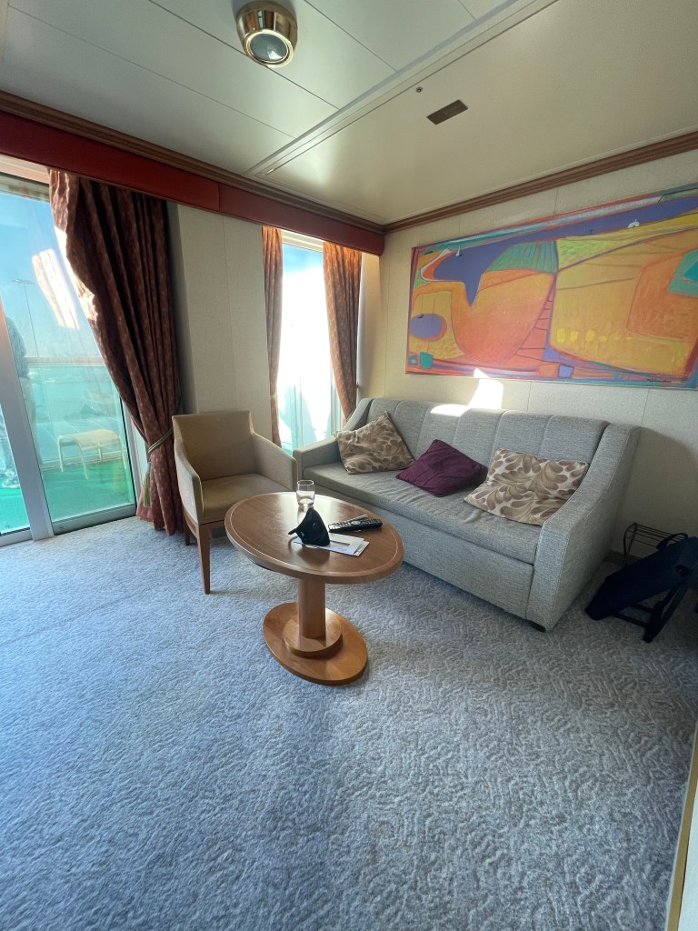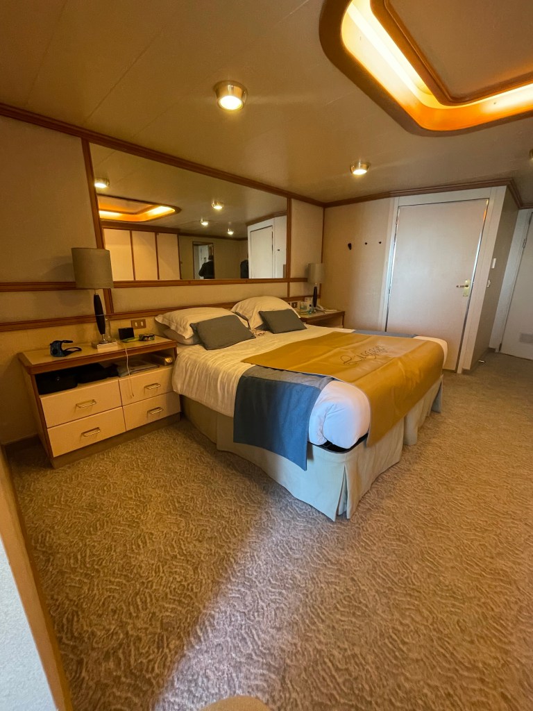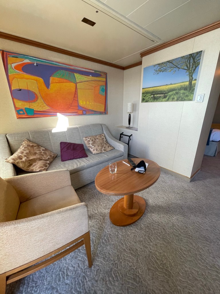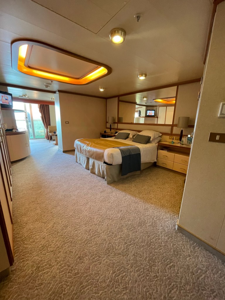 In the sitting area you have one USA socket to the far left, then 3 Uk sockets to the far right and that’s all. In the bedroom there is no sockets except one behind the bed which is also Uk so if you need an extension you can ask your cabin steward or take your own as long as it’s not a safety one. The fridge is in the bedroom section of the round area under the tv and the tea, coffee and kettle are on the opposite side in the sitting area under that tv all which can be seen in detail on my vlog in the link above. We loved the space it is a little noisy as the staff door is opposite you but it didn’t bother us and it’s a shame we are not in the same cabin in April so we can compare the difference if any from dry dock but we just couldn’t afford it and if I remember right they had already sold out.